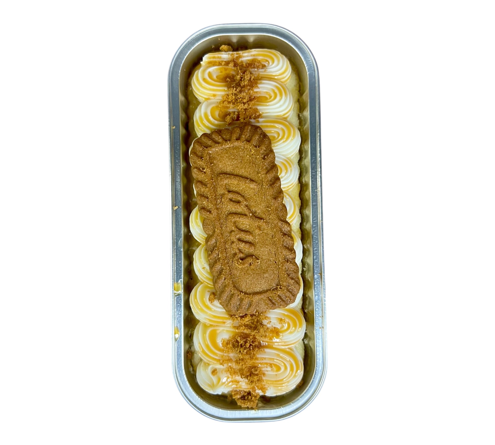 Savory Almond-Vanilla mini-loaf cake with Vanilla Icing topped with a Biscoff Cookie Crumble adorned with a whole Lotus Biscoff Cookie with a Caramel Drizzle